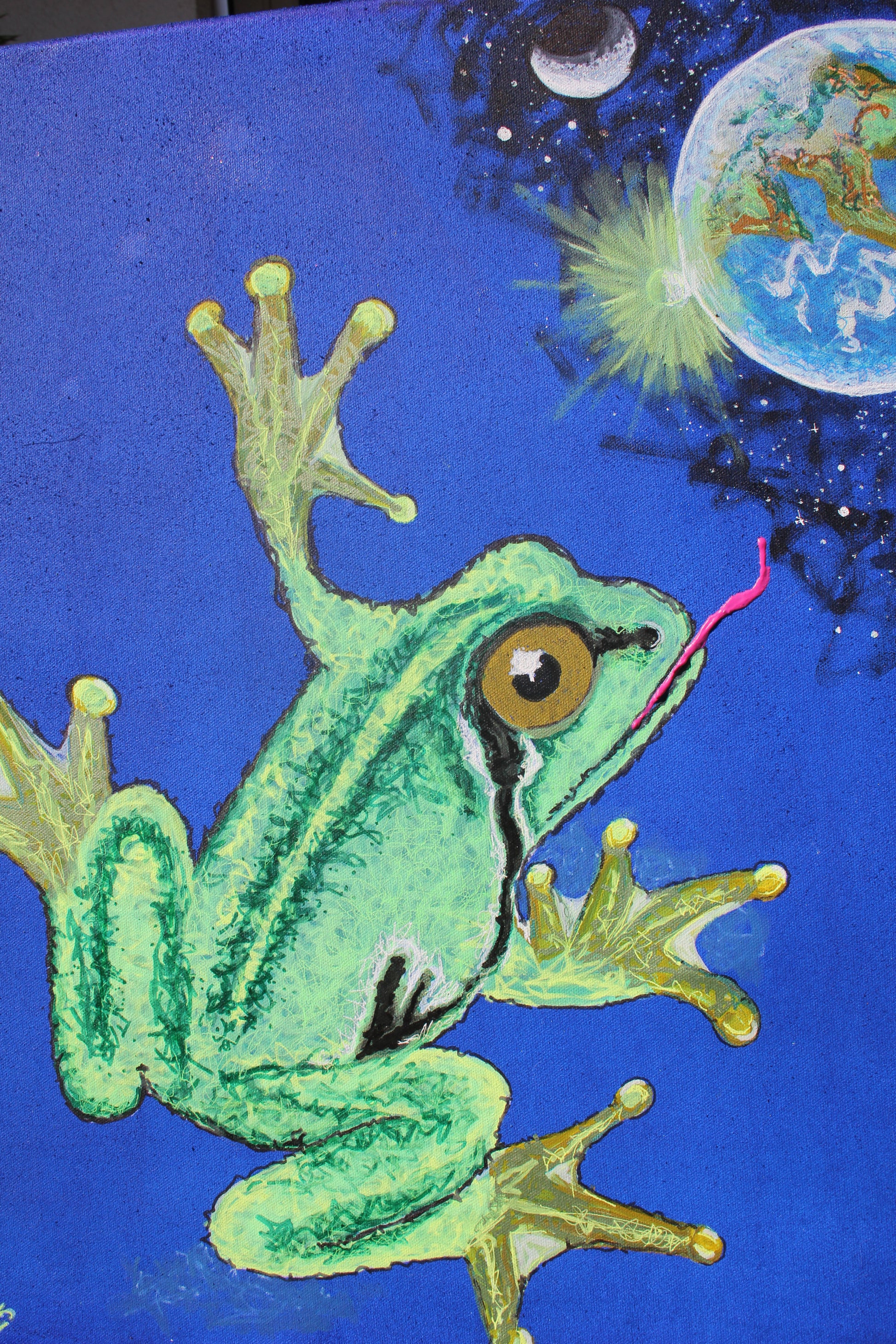 50x60 cm amphibische Abrechnung. Dieser Frosch wartet nicht auf deinen Kuss – er holt sich, was er will. Mit der Zunge direkt ins Weltall, um den ganzen Scheißplaneten zu verschlingen.