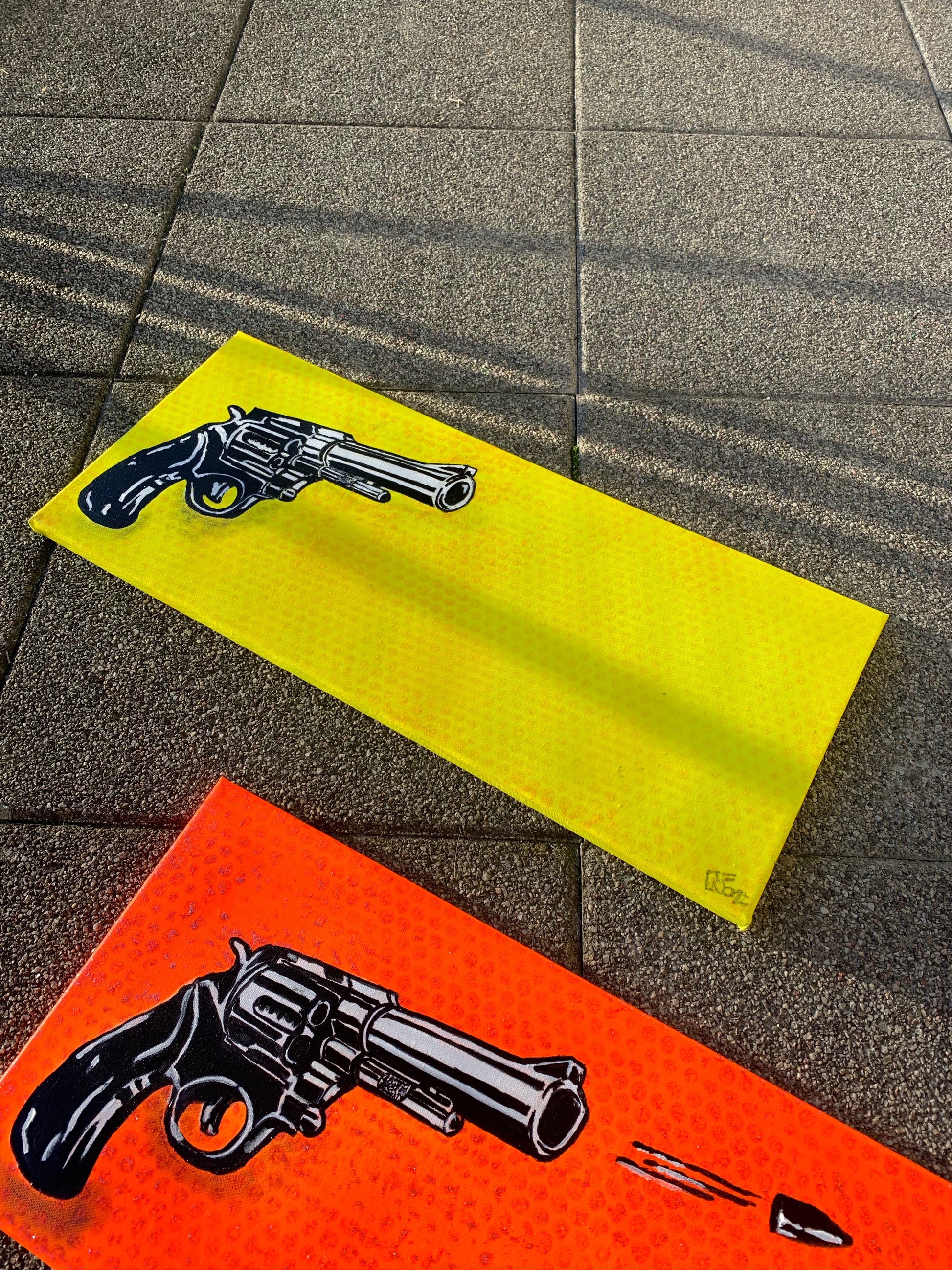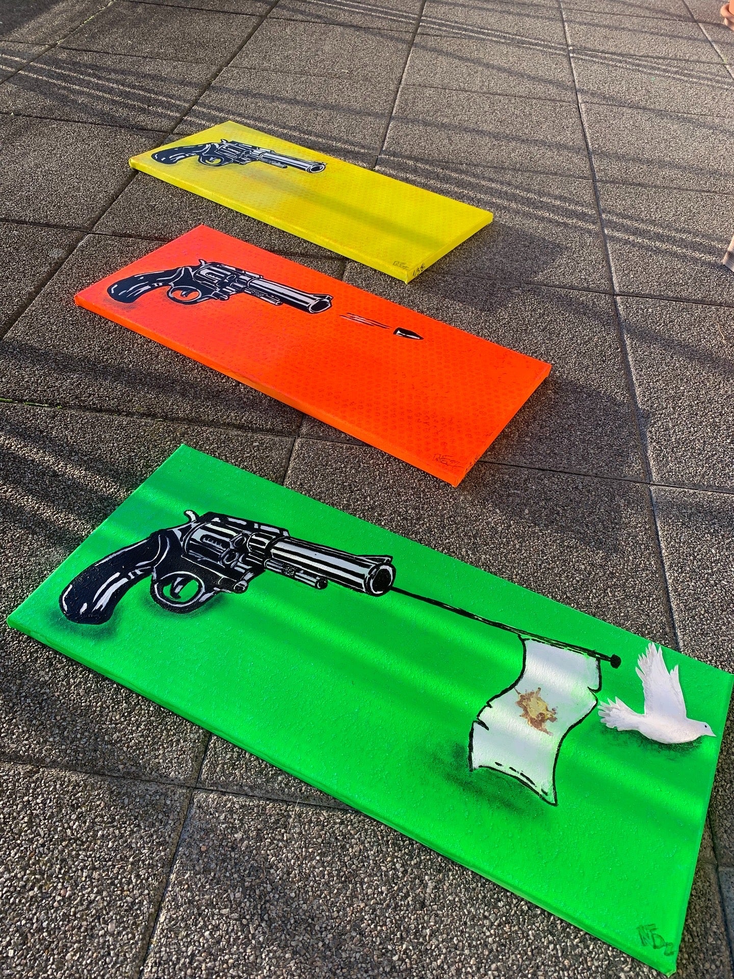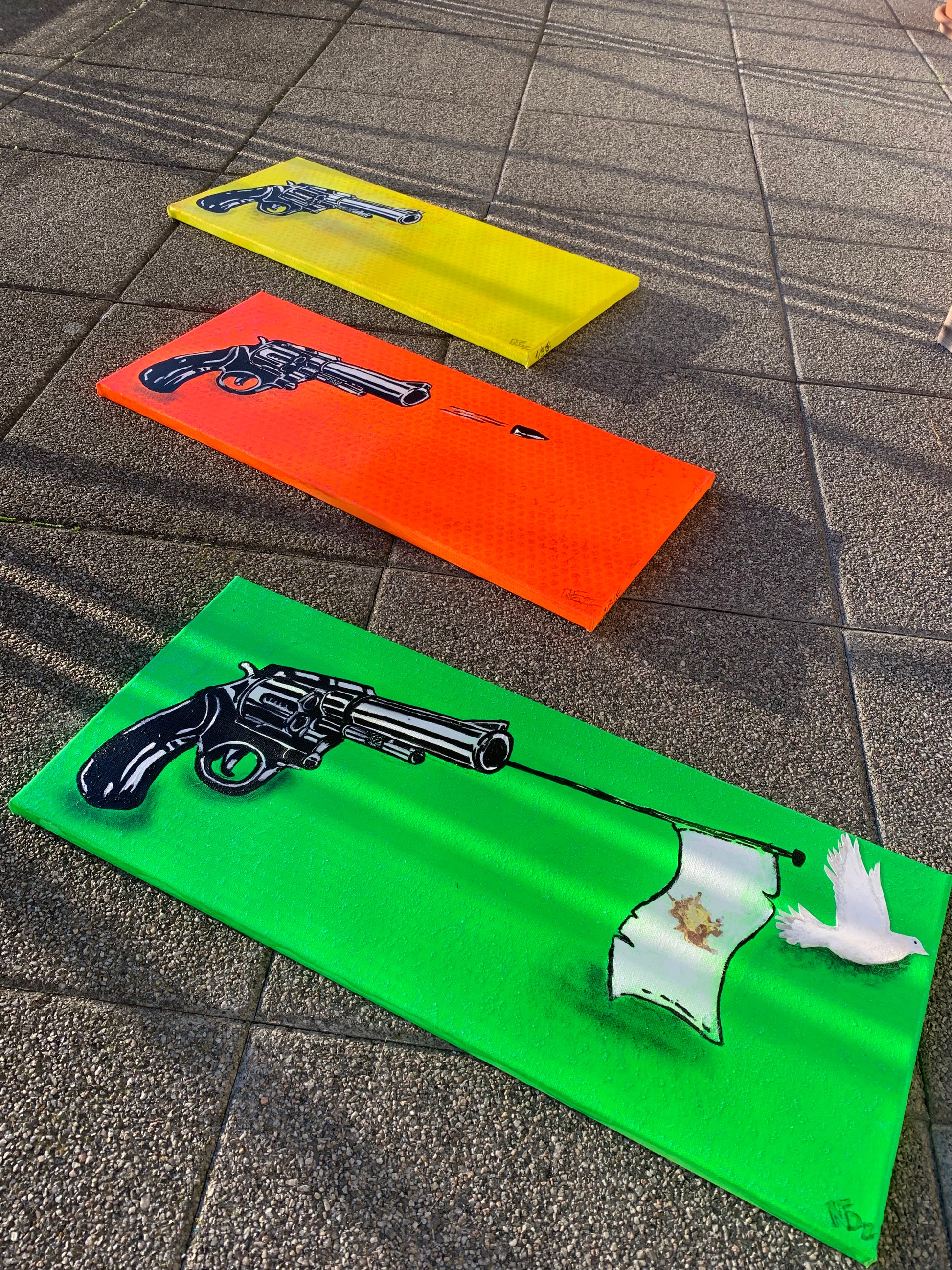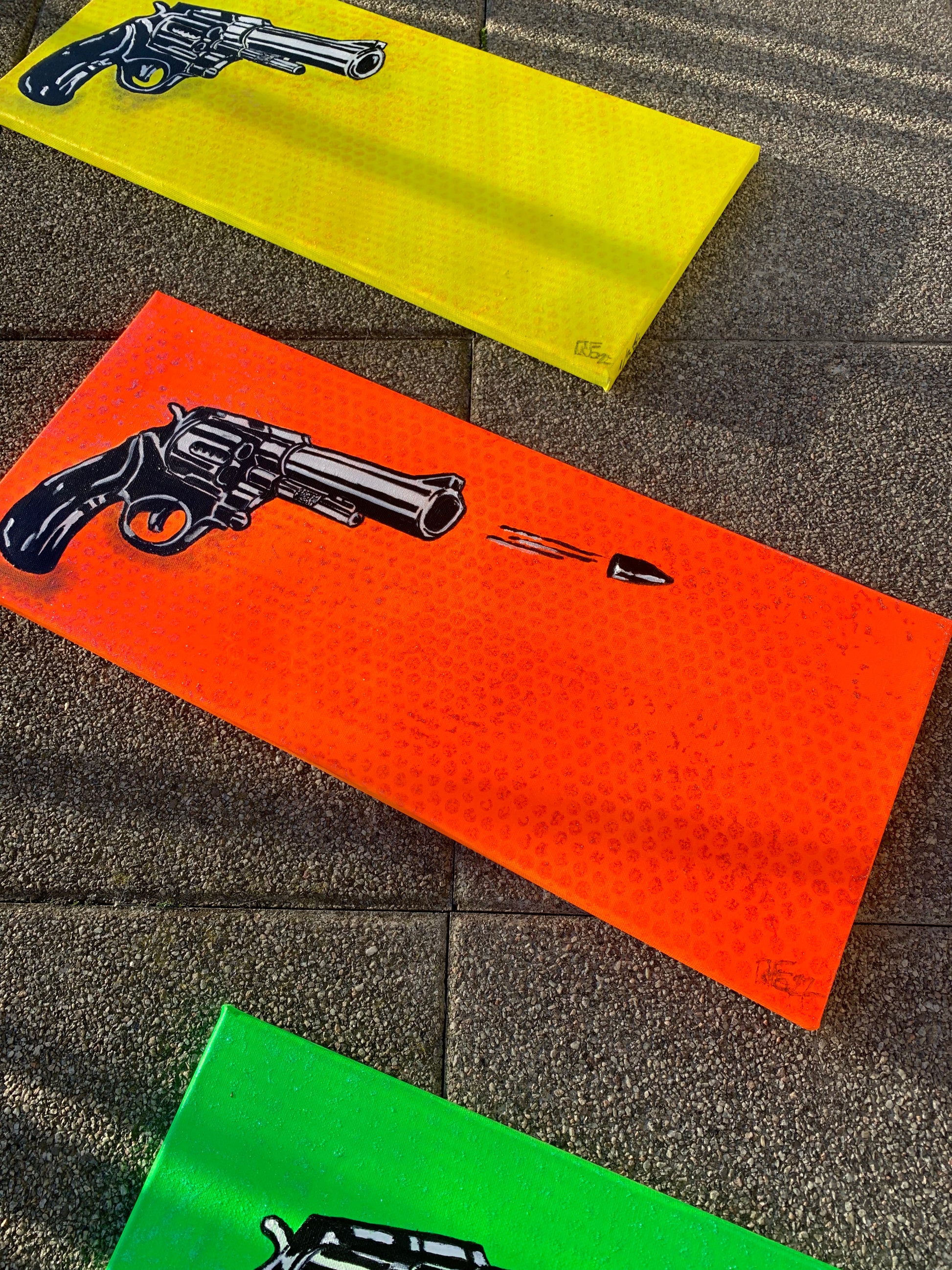 Ein Triptychon, 25x58 cm pro Teil. Revolver in Gelb, Orange, Grün. Siehst du die Kugel fliegen? Siehst du die Friedenstaube, die am Ende die weiße Flagge hält? Zu spät....