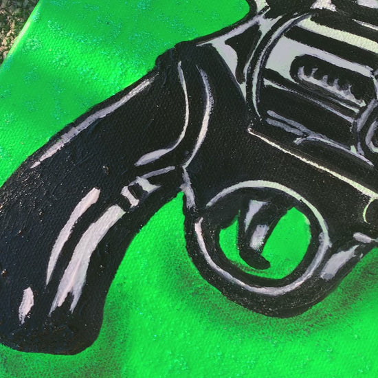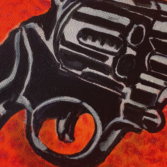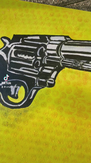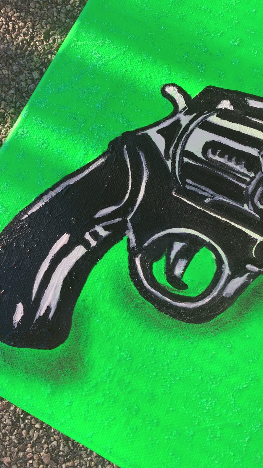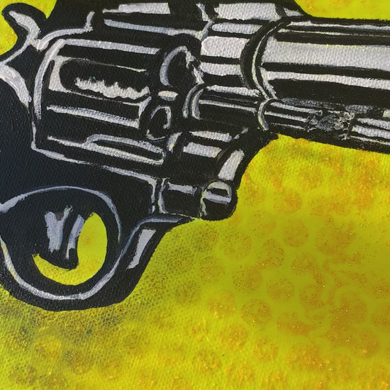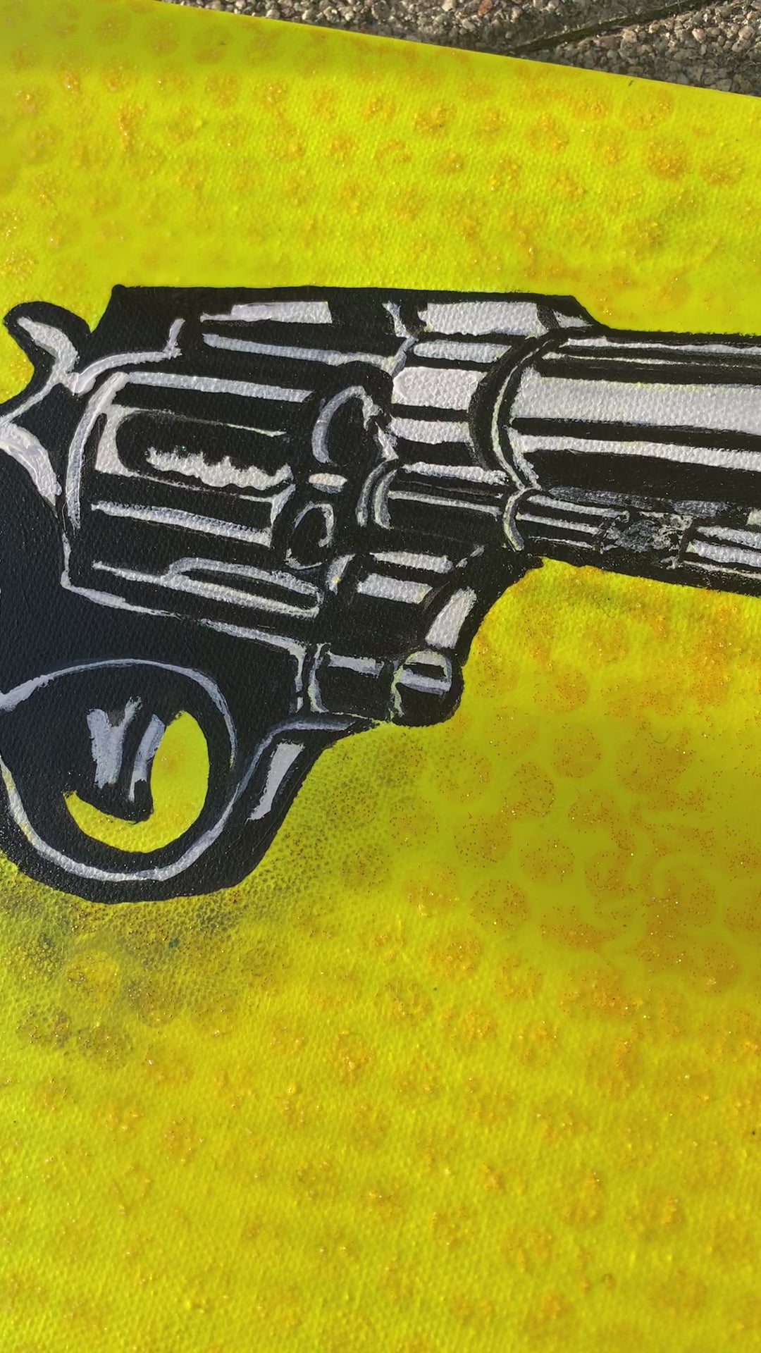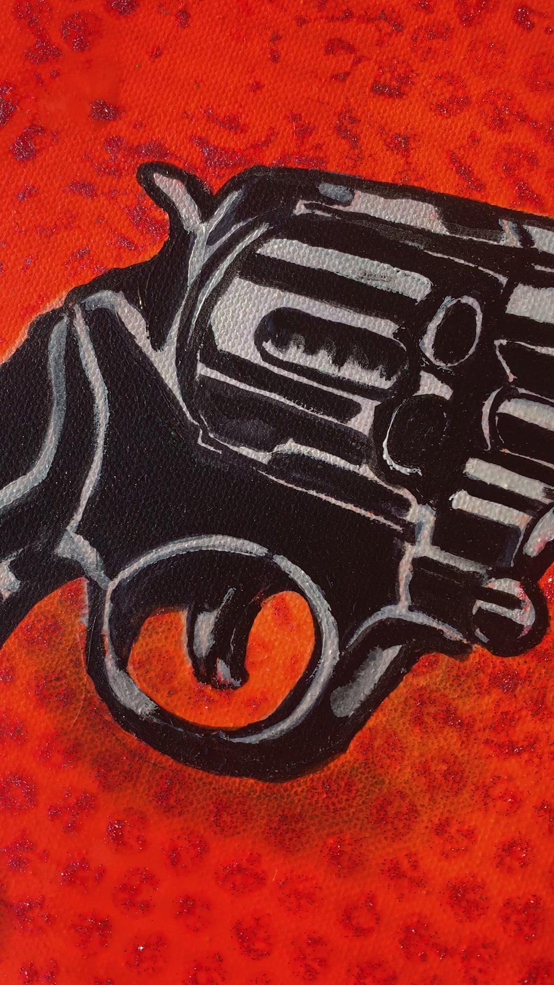Ein Triptychon, 25x58 cm pro Teil. Revolver in Gelb, Orange, Grün. Siehst du die Kugel fliegen? Siehst du die Friedenstaube, die am Ende die weiße Flagge hält? Zu spät....