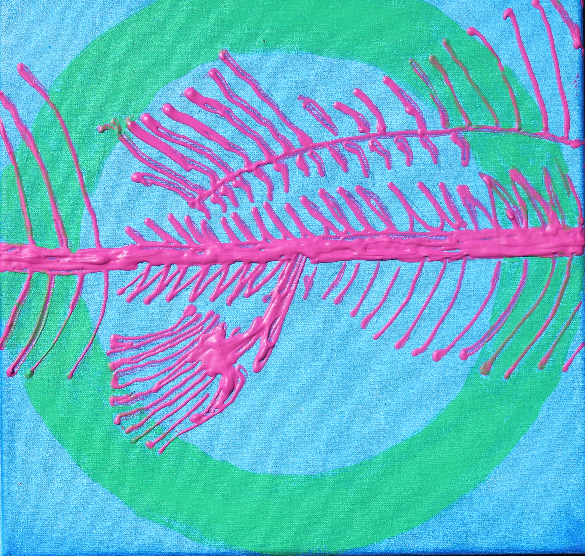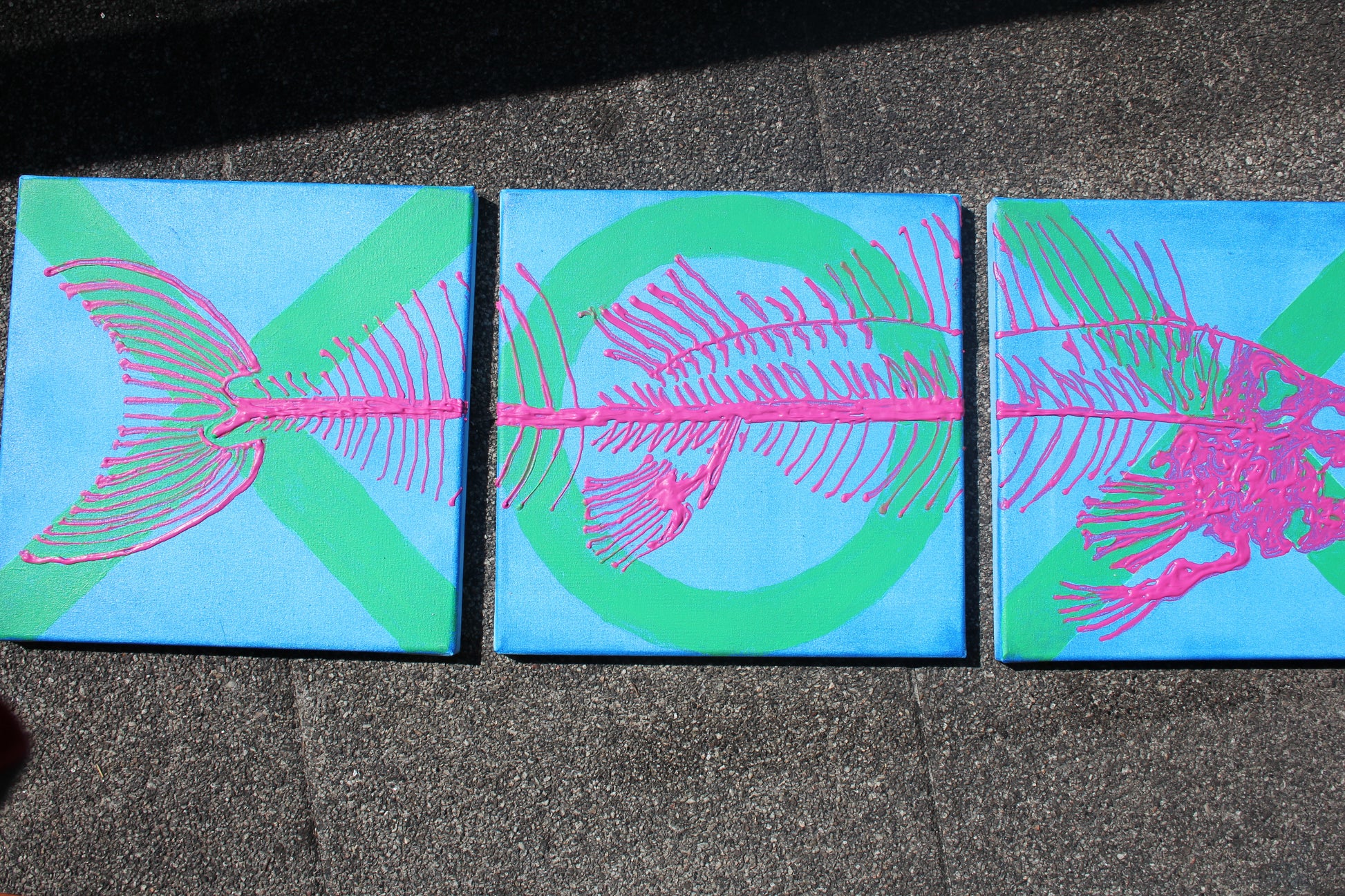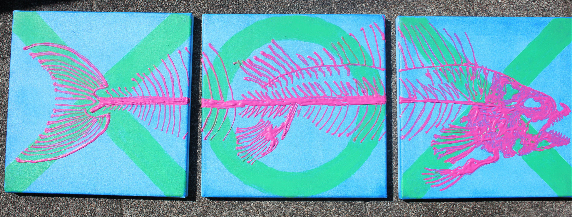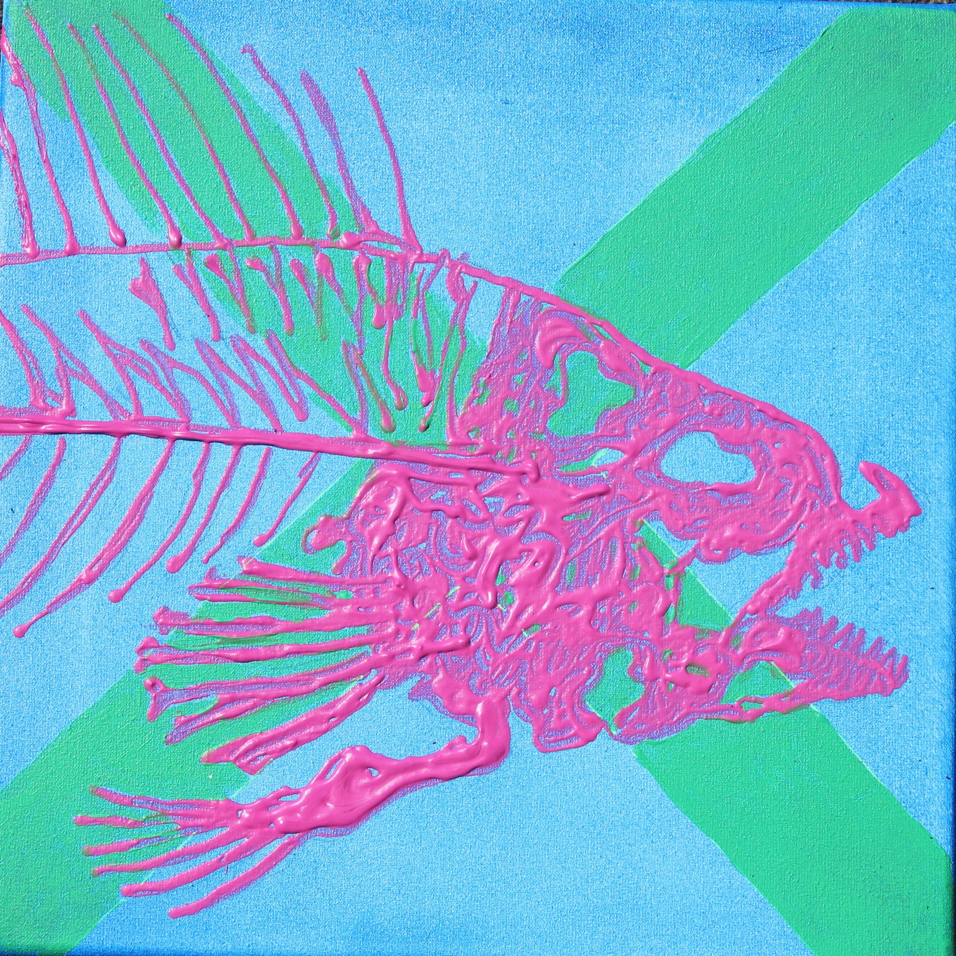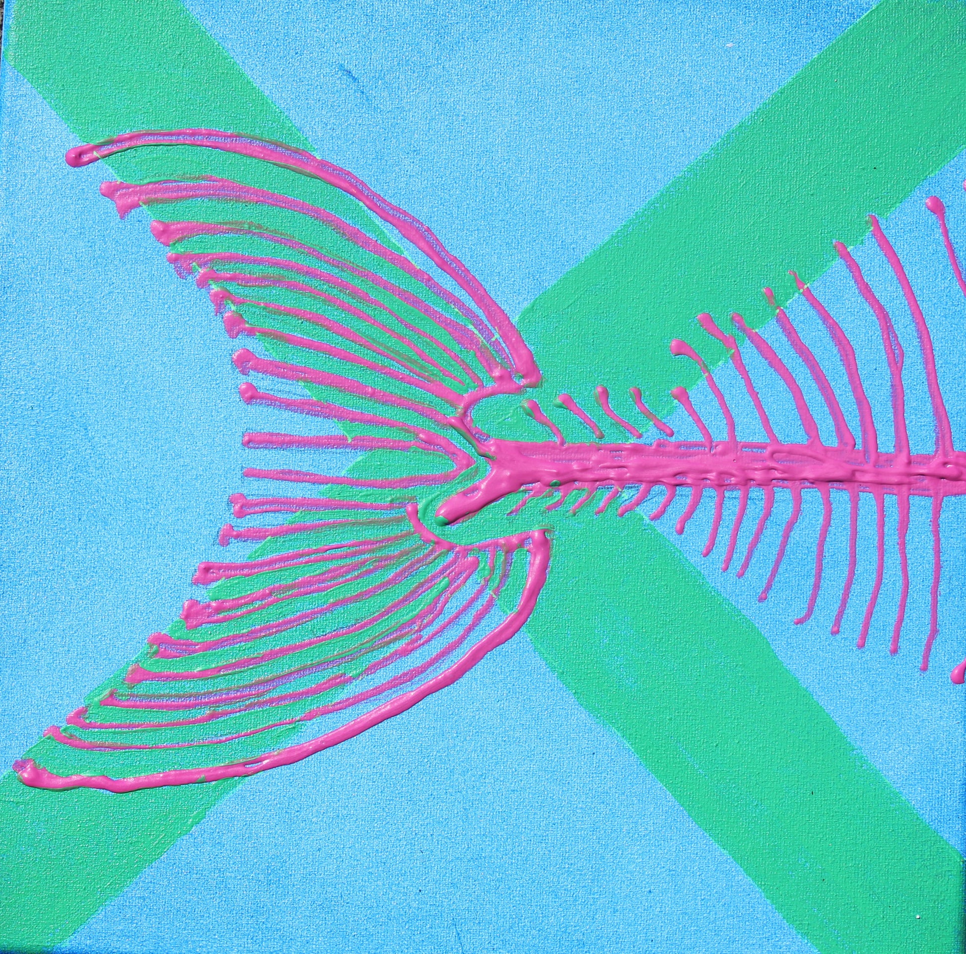 Drei Teile, je 30x30 cm. Im Hintergrund: XOX wie Küsschen zum Abschied. Drüber: Die knallharte Realität in Form eines Fischskeletts. Acryl auf Leinwand.